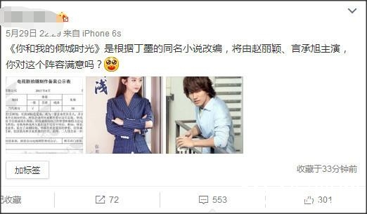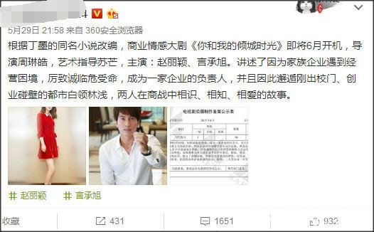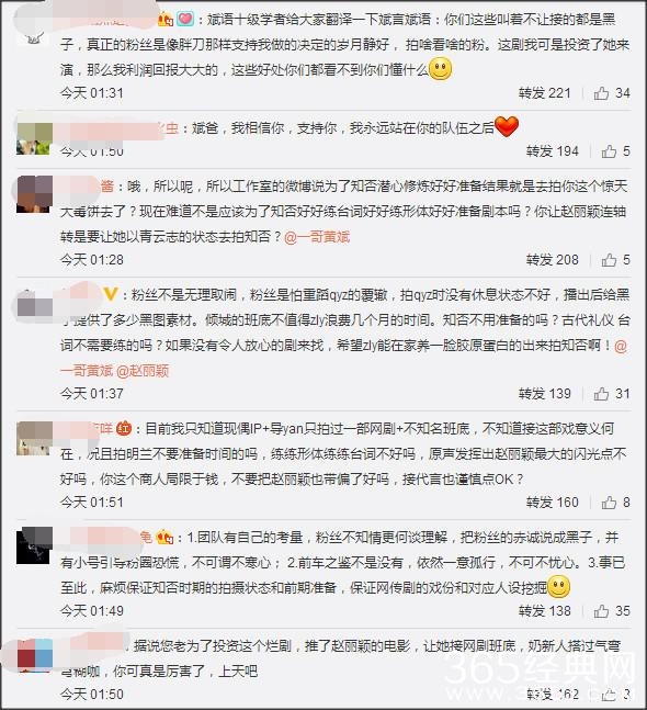 也有粉丝说团队为了接拍烂剧,推了赵丽颖的电影,搭过气弯弯糊咖(这大概是说言承旭?)。直指这部剧集的导演和班底都不入流,希望赵丽颖能够专心拍大剧本,不要浪费时间。