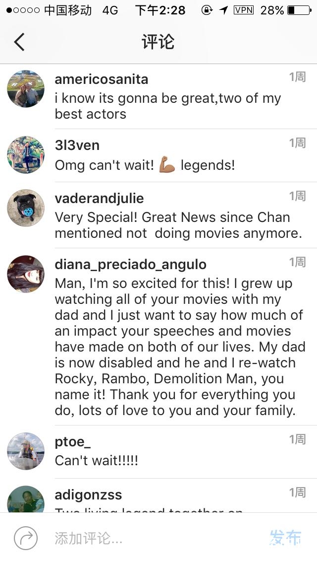 这次合作机会对于他们两个都是很难得的。史泰龙特意发布一条Ins表明两人要合作,他说:“这是个超赞的一天,当我和成龙能走到一起,成龙是我认识的最棒的,最勇敢的动作明星。