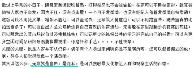 对于红还是不红,万茜的说法中最关键的一点便是“隐私”。一个接地气的演员,能够更好的与群众接触,观察生活百态,能够更好的磨练演技;但太红了却失去了这样的机会。