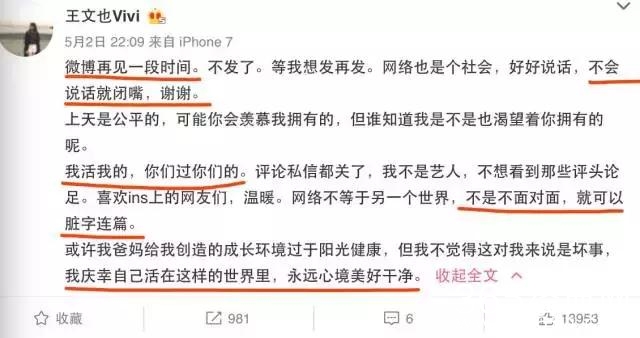 王文也很快在微博表示,自己要告别微博了。“我活我的,你们过你们的。评论私信都关了,不会说话就闭嘴,不是不面对就可以脏字连篇”