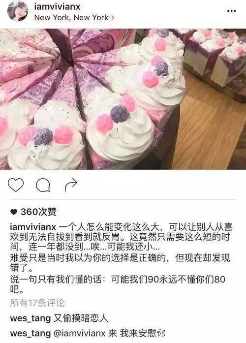 王文也还在instagram表露心迹:“一个人变化怎么能这么大,从喜欢到无法自拔到看见就反胃。”