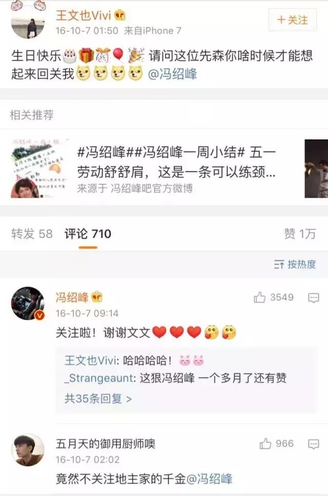 功夫不负有心人,冯绍峰终于在微博关注了王文也……网友也觉得,冯叔早就该关注地主家的千金啦
