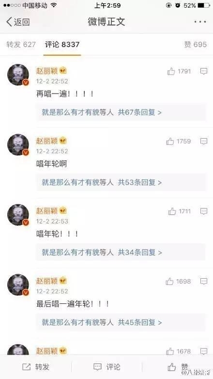 八过,你以为粉丝会这么轻易放过她?直播现场还不停的让赵丽颖唱年轮~因为之前赵丽颖一直求汪苏泷翻牌唱这首歌!被粉丝怼的无可奈何的赵丽颖,不得不败下阵来,大笑直呼不聊了~