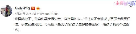 黄毅清听到黄奕的这番言论后暴怒,直言黄奕和马蓉是完全一样类型的人。表示自己从来不会瞎说,更不会乱冤枉谁。事实就是如此。马蓉也不是为了给“孩子更多的安全感”,给孩子找两个爸爸么…