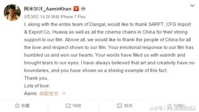 昨天印度片摔跤吧爸爸入账1千4百万。排在第二名,现在已经破10亿,满载而过。阿米汗用微博表示感谢中国影迷。
