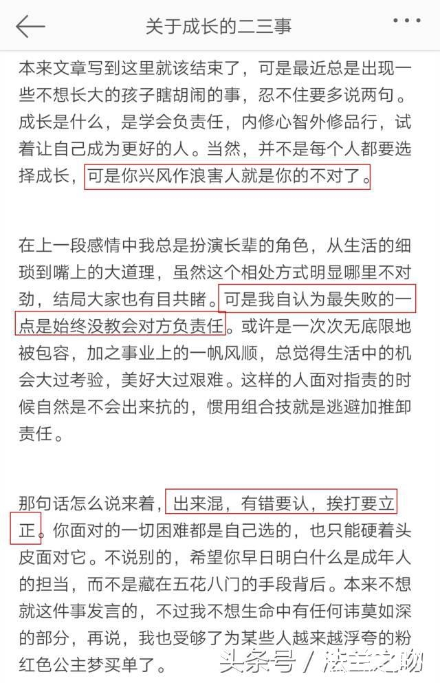 9月份,许婧在个人的微信公众号上发了一篇文章,疑似在指责陈赫逃避加推卸责任,更是喊话“有错要认,挨打要立正”。