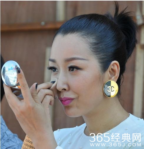 某次演出后台,孙悦亲自动手补妆,对镜露笑容怡然自得。不过,其耳朵上那副名牌耳环着实是亮点。
