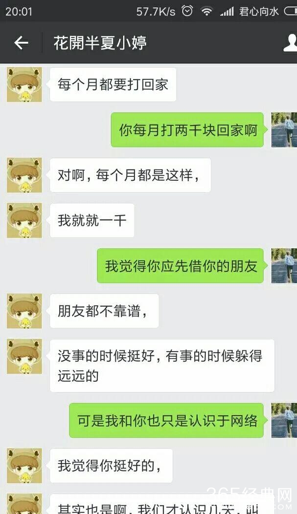 但是女主也不是省油的,看一计不成再来一技,继续卖惨,大概意思就是:每个月都往家里打钱两千,不往家里打钱,家里人会没钱的,现在只有一千,希望男主借给他一千,我相信很多人都不会把钱借给一个认识没几天的人,还是在网上认识的,男主肯定也不会,继续扯皮球,要女主和朋友去借钱,女主说:“朋友不靠谱,没事的时候挺好,有事的时候躲得远远的”,从这句话我们可以大概猜测女主可能也不是一个靠谱的人,因为一个靠谱的人混得再差,她也得有一两个靠谱的朋友,最后女主放出大招:“我觉得你挺好的”,这句话是不是说得很暧昧,情感经历少的人会觉得她对自己有意思了。