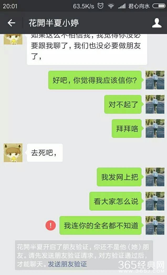 可是男主很清醒,没有被她冲昏头脑,男主说了一句中肯的话:“你觉得我应该相信你吗?”,是的,那个人会在网上把钱借给一个陌生人,而且认识才两天,一个女孩有多无助会在网上借钱,还是陌生人的,这怎么会让人相信呢。女主应该是被揭穿了,有点恼羞成怒了,直接开始咒骂了:“去死吧”,男主最后一句多么的无奈:“我连你的全名都不知道‘所以你的名字是?然后男主把这件事发在了网上。