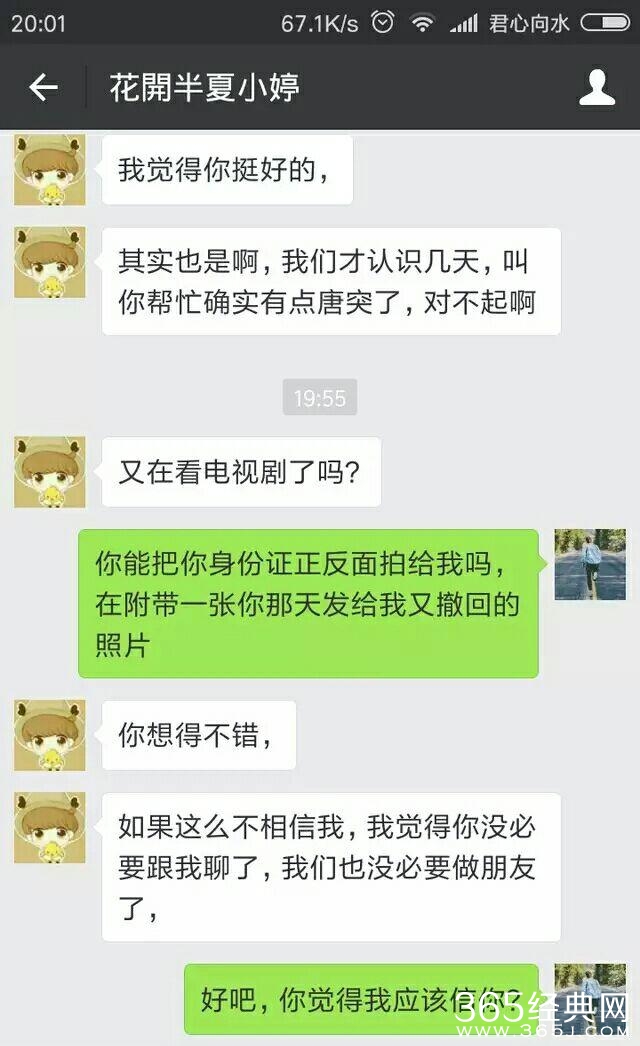 女主使用这一招,男主决定要借钱给她了,但是由于不认识,也没有见过面,所以男主让女主把身份证正反面发过来,还要附带一张认识第一天撤回的照片。女主看情况是骗不过去了,又用一招:威胁法,直接说:“你不相信我,我们也没有必要做这个朋友了”,想要以此吓住男主。