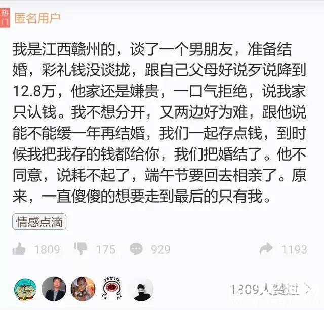 今天我们分享一个被彩礼拆散的“苦命”鸳鸯的事,女主家是江西赣州的,打算和男朋友结婚,但是因为彩礼的事情没有谈拢,女主的父母要的太多,女主的男朋友(以下称男主)家里不是太富裕,拿不出这么多钱,女主就和父母商量最后把彩礼定为12.8万,可是男主他们家还是嫌贵,男主一口就拒绝了,说女主家只认钱,女主考虑到女主没钱,而父母又想要钱,所以想和男主把结婚的事情推迟一年,一起存点钱到时候女主把自己存的钱给男主,然后再结婚,男主说他不同意,他耗不起,要端午节回去相亲了,最后女主被以拜金女的形象给男主抛下了。