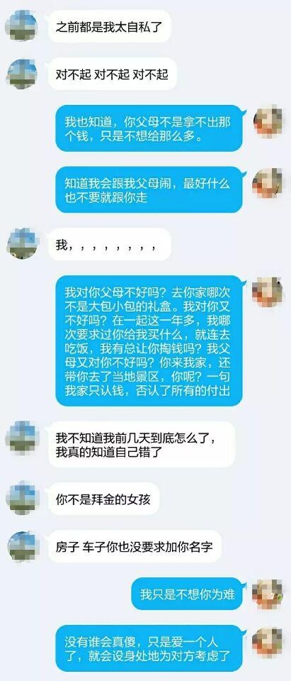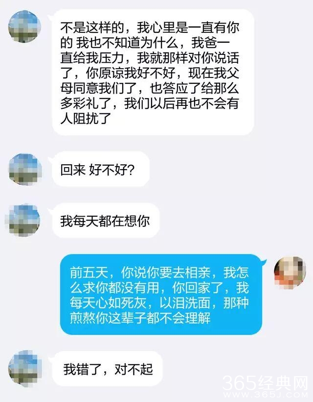 然后男主把一开始没有答应女主彩礼的锅甩给了他爸,因为相亲碰壁,男主父母又同意了女主家的彩礼条件,发现只有女主长得漂亮而彩礼又是不太过分的时候,让女主回来,并加大感情攻势:“我现在每天都在想你”,到这时候女主的情绪爆发了:“前五天,你说你去相亲,我怎么求你你都没有用,你回家了,我每天都心如死灰,以泪洗面,那种煎熬你这辈子都不会理解”。男主开始一味的道歉。