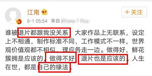 但就在今天,不少眼见的网友发现此书的作者最新的一条微博十分耐人寻味。微博里多次提到了退片,并且说道,做得好,鲜花簇拥是应该的,做得不好,退片也是应该的。似乎间接肯定了先前被退片的传闻是真,并且在最后非常无奈的写到,人生在世,都是自己的缘法。果然是作者,写个微博都十分晦涩文艺,但是不难感受得到他淡淡的悲哀啊!被退片当然不好受,但毕竟人家只是卖版权,真正拍摄并不归他管,这也是很无奈啊!