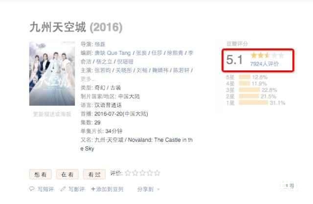 《九州天空城》由张若昀、关晓彤、鞠婧祎、刘畅、陈若轩、朱圣祎、张鲁一、刘敏等联袂主演。这部剧开拍之初的动静很大,粉丝们也是很期待。但是实际播出时骂声一片,更是只得到区区5.1分的评分。延续着九州系列的不利因素,《九州缥缈录》、《上海堡垒》和《龙族》的大电影项目目前为止应该都没有开机。如此看来《海上牧云记》也不算最惨的!