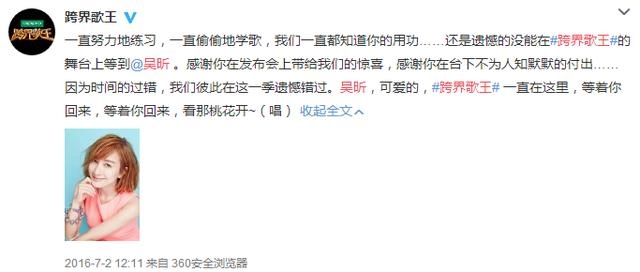 而后官博用“时间的过错”回应了此事,并声称一直在等待吴昕归来……看来档期相撞真是官方回应的最佳理由!