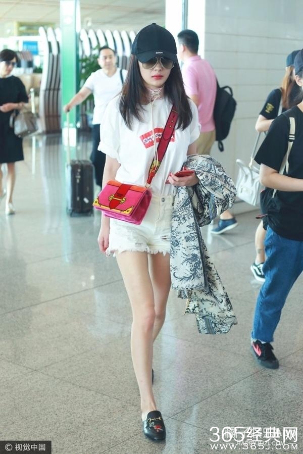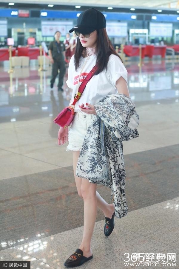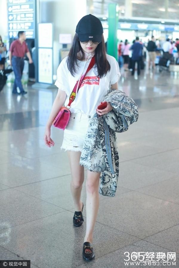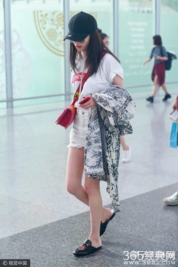 大幂幂穿白色Logo印花圆领T恤,下身搭配白色破洞毛边牛仔短裤,脚踩Gucci家的黑色爆款拖鞋!全身纯白色单品为主,手上拿的印花长款外套做外搭也不显得杂乱!