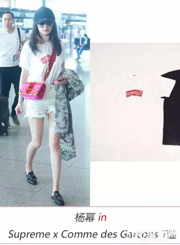 这一身的爆款单品挺多,白色T恤是Supreme x COMME des GARCONS合作系列,胸前有标志性红色印花Logo!