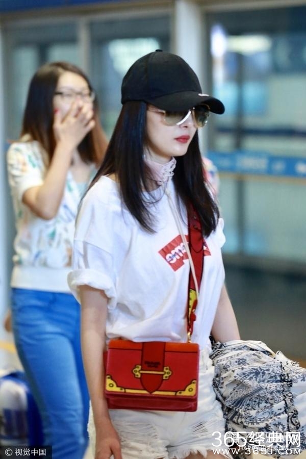 细节方面大幂幂也很用心,斜挎的Prada红粉色撞色天鹅绒手袋,头上戴着黑色棒球帽,架黑色渐变墨镜酷炫十足!