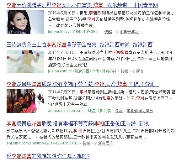 李湘被指炫富,从给女儿王诗龄买奢侈女童装,到晒一张游艇全家旅游照等等,李湘似乎随意在网上po出任何照片,网友们都在恶意揣测她的“炫富”用意,甚至只是她谈及在家一顿简单的饭,都被媒体写成是“一个月伙食费高达七万”。