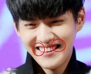 看吴亦凡的笑容,由于牙弓角度比较小,笑起来嘴巴两边(红圈的位置)是空的。