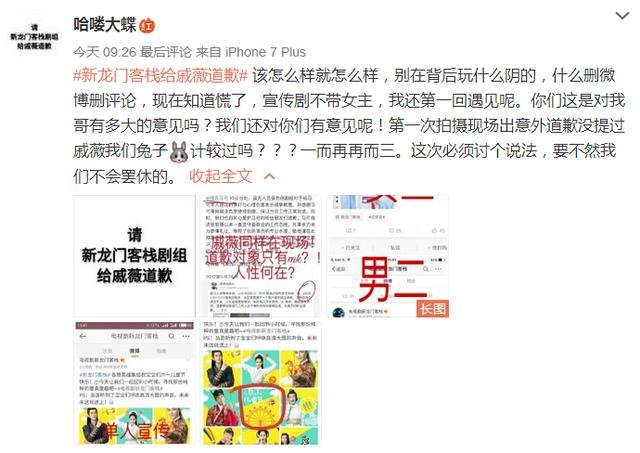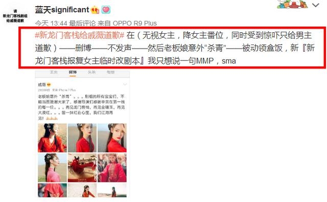 小编进入微博话题“新龙门客栈给戚薇道歉”,一探究竟,原来戚薇在意外杀青前就遭到了剧组多次不尊重,刻意无视女一号,官方宣传也不带女一号的海报....