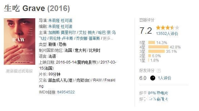 观众不仅能在电影里看到有血有肉的画面,更能在女主身上体会到“有血有肉”的女性形象。这也难怪《生吃》能在“烂番茄“上保持那么久的新鲜度,并在豆瓣上取得7.2的高分。