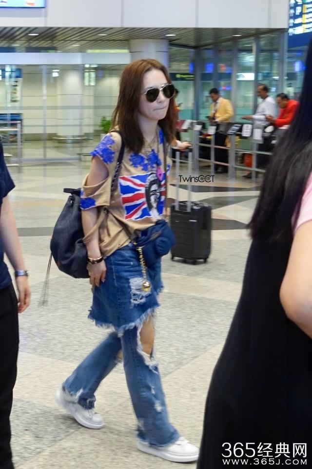 而阿娇这个破洞的牛仔裤,这个洞破得也太大了。而且这个肉色t恤,看起来总感觉怪怪的。