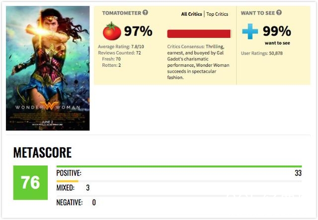 ▲该片的烂番茄口碑97%,MTC均分76