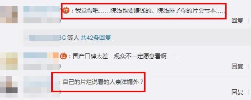 有几位网友说的也是很在理,自己这么变相宣传自己的电影也是为了赚钱,但是院线也是要赚钱的,排多了你的片子是肯定要亏本的,还有网友表示“自己的片烂说看的人崇洋媚外?”