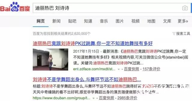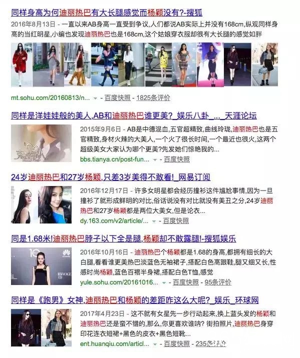再去看看百度等搜索引擎,也是清一色重灾区,只要输入迪丽热巴和其他女明星的名字,弹出来百分之八九十全是说迪丽热巴比对方演技好、年轻、漂亮的稿件。