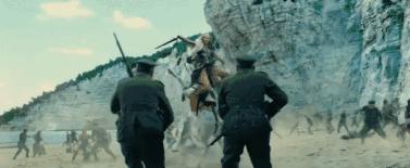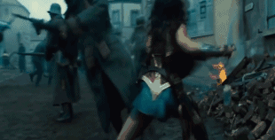 电影里的第一场打戏,发生在亚马逊人和德国士兵之间。士兵用枪,亚马逊人用的全是冷兵器——剑、弓、盾……