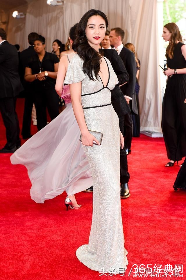 大V领晚礼服,过深的姨妈红唇色有些显老。正红色或者西柚色,会更贴合汤唯的气质。