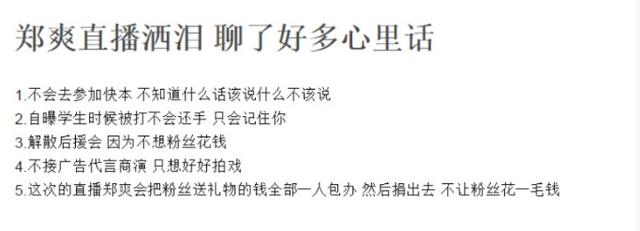 在直播中,郑爽回忆自己的往事,完全打开心扉说出了自己的真实的想法。有网友总结了郑爽这次直播的内容主要以下五点。