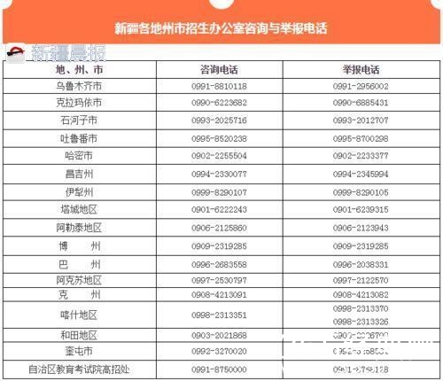 【新疆公布各地、州、市招办咨询、举报电话】6月3日,自治区教育考试院公布各地州市招生办公室咨询与举报电话,欢迎社会各界监督、举报普通高考过程中的违法违规行为。