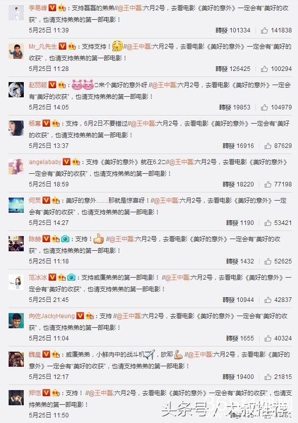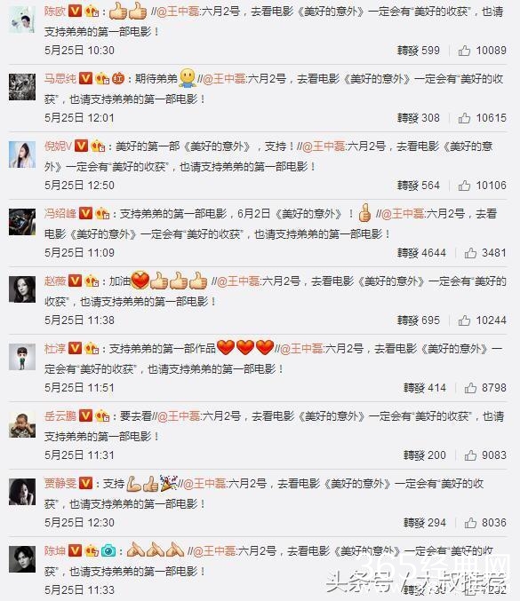 还记得前几天大叔发的一篇文章叫《王中磊一条微博,整个娱乐圈的明星大碗都来拍马屁》吗?当时整个娱乐圈的明星大碗都转发支持,包括赵丽颖、陈坤、大幂幂杨幂、AB、范冰冰、赵薇和郑恺等等,说是整个娱乐圈都来拍马屁有些人还不相信,那大叔就直接上图啦了,像下面的这种图还有好几页