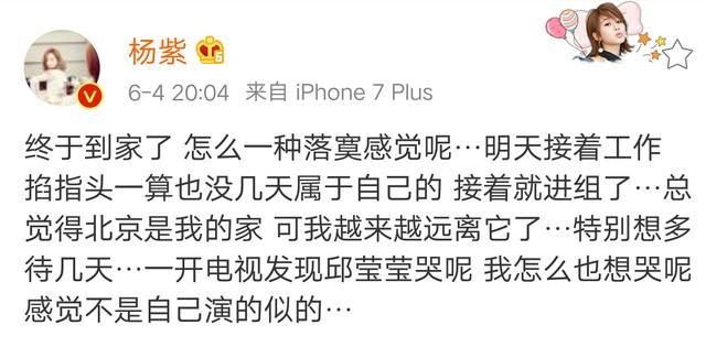 杨紫发微博称自己虽然回家了,却有一种落寞感,开开电视看到邱莹莹,自己很想哭。