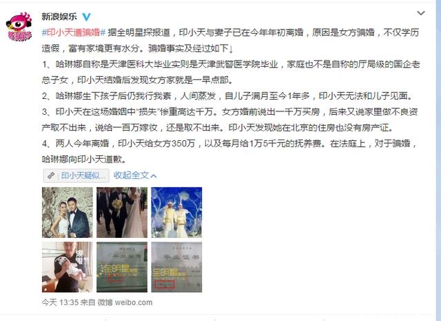 据卓伟爆料,印小天和前妻哈琳娜的婚姻完全是一场有预谋的诈骗,哈琳娜为了和印小天结婚,精心编织了一个谎言,说自己是中央财经大学毕业的研究生,但实际上,哈林娜只是天津医科大毕业~!因为印小天是明星,家庭也是传统的军人家庭,哈林娜为了一个门当户对,因此就骗印小天说自己是富二代,父亲是国企高管...... 但实际上,哈林娜家只是一个开小卖部的!