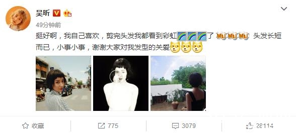 而今吴昕不但秀了 一下自己的新发型还说:“挺好的,我自己喜欢,剪完头发我都看到彩虹了”并感谢大家对他发型的关爱,随后发了三只狗表情,哈哈,还挺幽默。