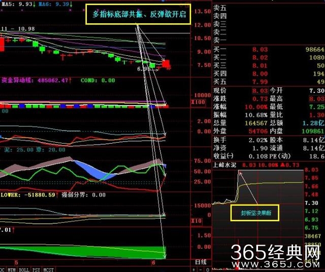 该股自2016.12.15创出15.67元高点后——回调——整理——下跌。至昨日回到上一波启动前的低点6.92元附近的6.95元以小十字星收盘,今日以涨停的光头阳线5分钱下影线报收宣告止跌企稳。多指标底部共振(动量线指标、趋势指标、macd指标、....)底部上叉给出买点,期待反弹!!!