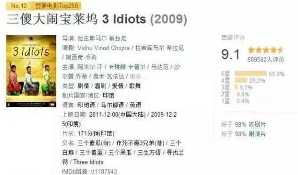 要知道9分以上的电影在豆瓣上可是不多的,可是《三傻》的评分是9.1,《摔跤吧》达到了9.2。