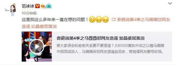 今天晚上,范冰冰对于近日正在发酵不利于李晨的事,更是用了奇葩说马薇薇怒怼网友造谣,并觉得这是她这么多年来一直想的问题。从范冰冰的字里行间中,我们 能够嗅到,对于网友说李晨当年插刀教事件,范冰冰认为这是一种子虚乌有,纯属造谣。