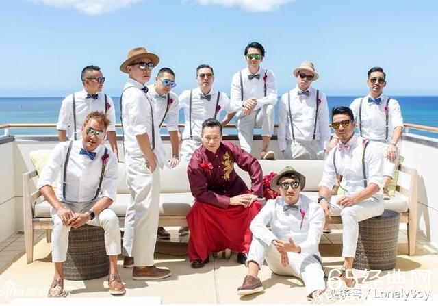 伴郎们统一是白色的搭配,唯有中间的肩带是黑色的,还有墨镜,蝴蝶结,和这碧海蓝天的夏威夷搭配简直完美。