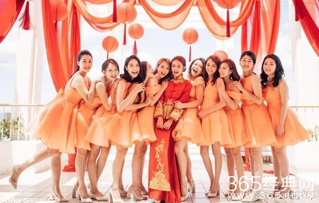 伴娘们统一穿着橙色的裙子,和安以轩的中国红很搭配,既不会抢了主角的风采,还会显的很喜庆。
