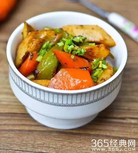 4、莲藕胡萝卜青笋去皮切滚刀块。