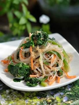 材料:粉丝、芥末粉、胡萝卜、菠菜、生抽、精盐、香油