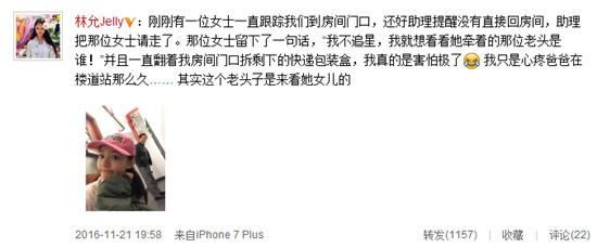 当然还有一些纯属误会的,如林允在成名后,曾与父亲牵手逛街,结果被一位女性一直跟踪,而且真到住宅,还翻脸门口的快递包装盒,还是助理出面解围,这才知道原来是因为父亲的好奇,一切都是误会一场。