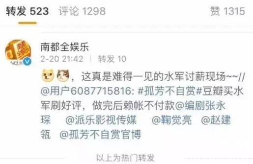 令人尴尬的是,《孤芳不自赏》还遭到水军讨薪风波。虽然官方很快出面澄清,但效果就不得而知了。