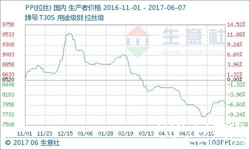 今日PP市场价格弱势整理。据生意社数据显示:6月6日PP(拉丝)商品指数为64.27,较周期内最高点100.67点(2011-09-19)下降了36.16%,较2016年01月18日最低点49.23点上涨了30.55%。(注:周期指2011-09-01至今)
