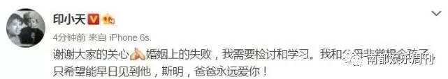 对此,印小天在微博中写道“谢谢大家的关心,婚姻上的失败,我需要检讨和学习。我和父母非常想念孩子,只希望能早日见到他,斯明,爸爸永远爱你!”