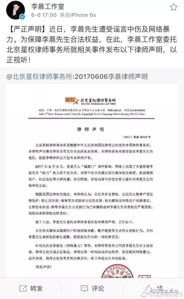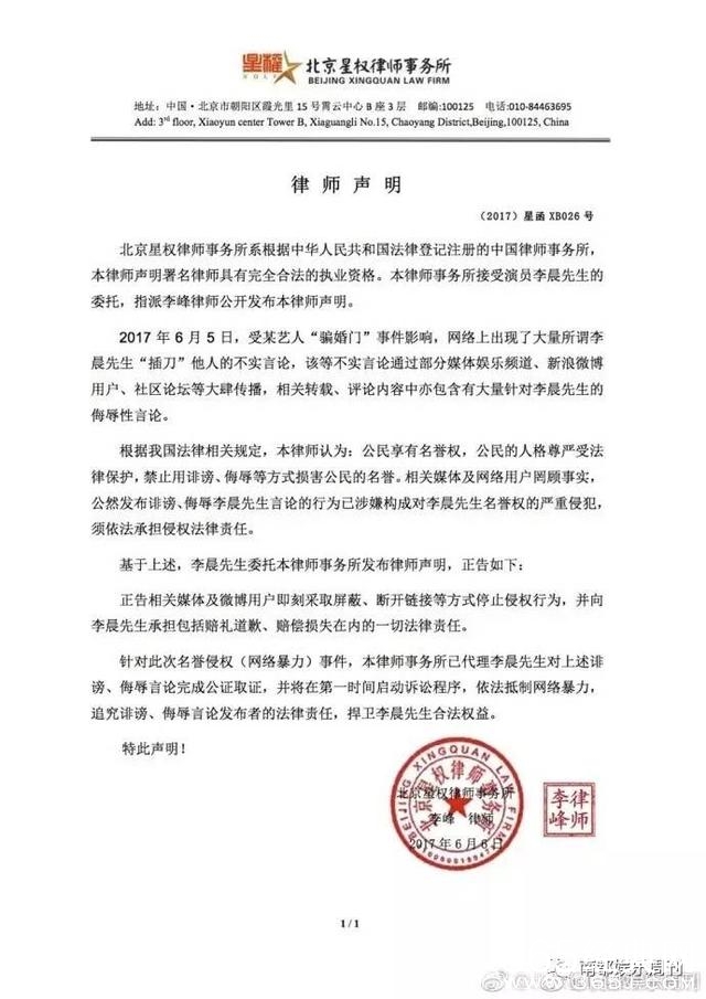 另一方面,因印小天被骗婚风波,李晨陷入“插刀门”。李晨工作室也发出律师声明方发表律师声明,表示李晨方将针对谣言中伤和网络暴力启动诉讼程序:受某艺人“骗婚门”事件影响,出现大量所谓李晨“插刀”他人的不实言论。这些不实言论被大肆传播,相关转载、评论内容中也包含针对李晨的诽谤和侮辱性言论,已涉嫌构成对李晨名誉权的严重侵犯,须依法承担侵权法律责任。李晨方完成取证,将第一时间启动诉讼程序。